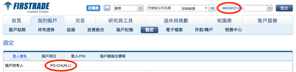 匯款附言要填你的 Firstrade 帳戶號碼跟申請時用的英文名,全部跟帳戶設定的一模一樣比較不會節外生枝(但銀行系統不允許你輸入 , 或 - 的話,換成半形空白也可以)。兩樣資訊可以在下圖所示的地方找到:
