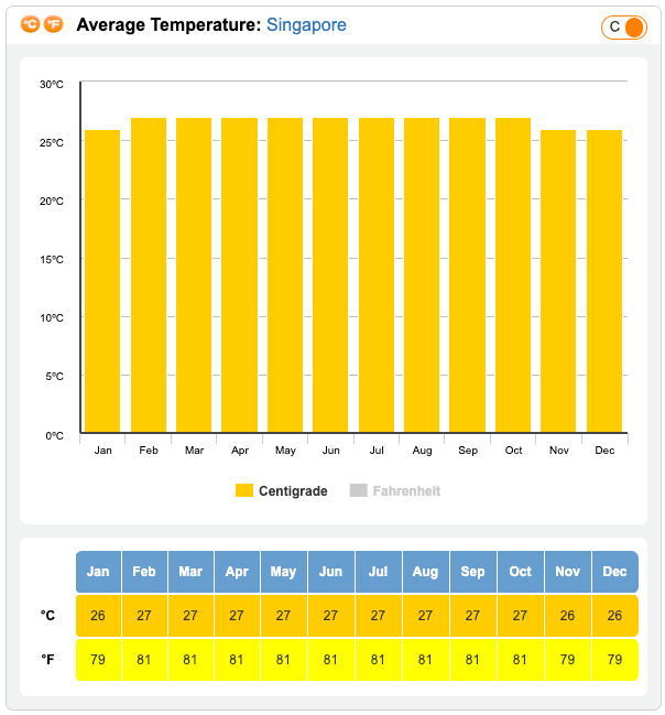 新加坡朋友問我喜歡新加坡嗎?我說我還蠻喜歡新加坡的氣候,大家都不可置信,怎麼會喜歡那熱死人的天氣?但其實新加坡全年月平均溫度都在 27 度上下,比起台北冬天 16 度、夏天 30 度,新加坡穩定得多,而且比台北的夏天涼 。不用換季,不用因應隔天突然變涼或變熱而準備不同的外套,更不會預估錯誤導致著涼。