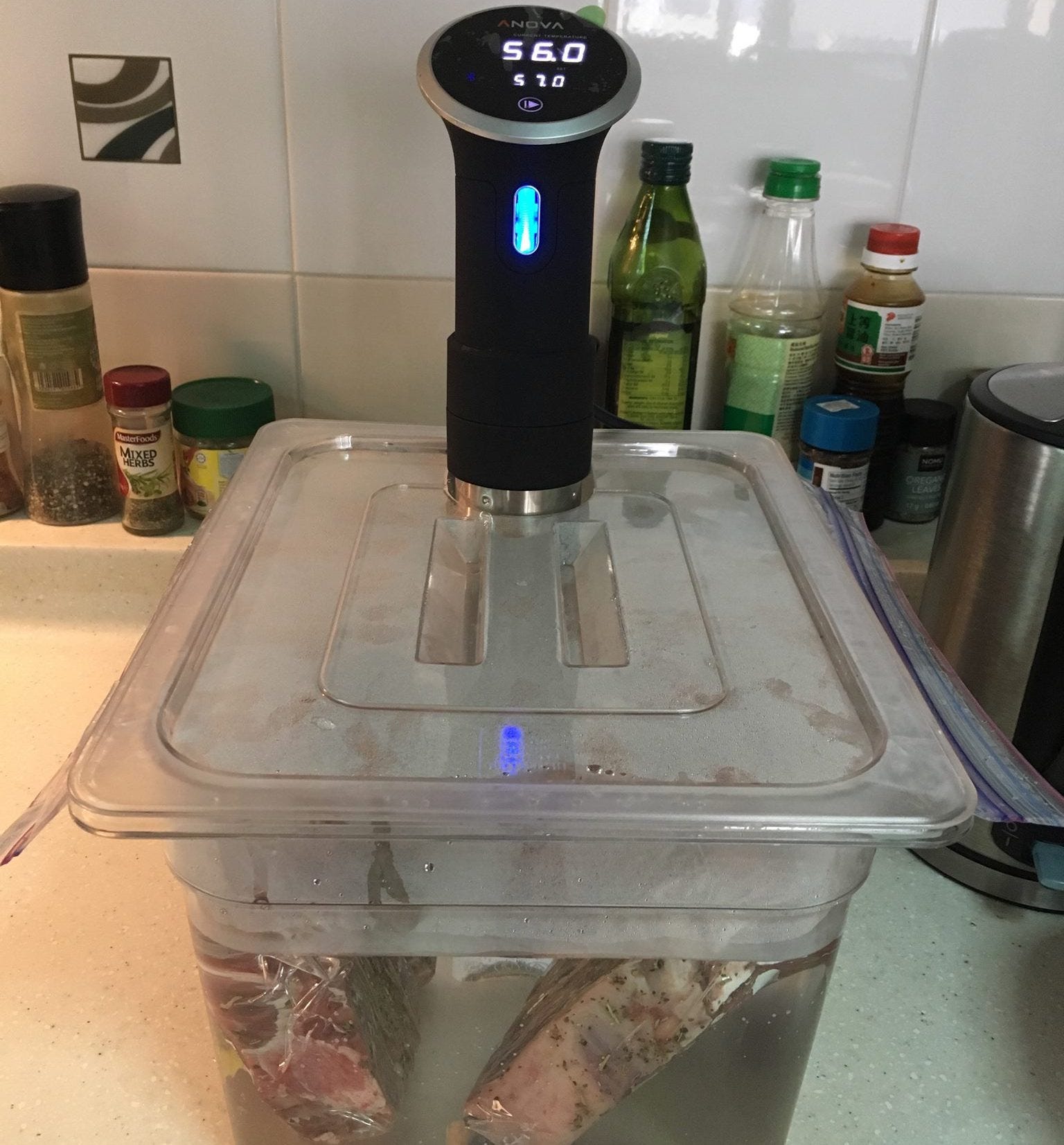 之前用 Anova 2 代舒肥棒跟專用水箱 → 現在很克難的用電磁爐舒肥
